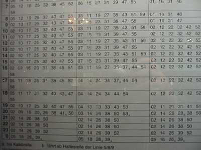 ↑トラムの時刻表です。路線ごとに記されています。各路線1時間に8本程度走っています。到着時刻は正確です。 |