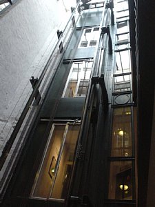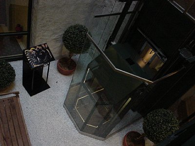 ↑吹き抜けにエレベーターがありました。ガラス張りのドアのエレベーターです。